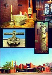 Beide Bereiche zusammen bilden ein Zentrum besonderer architektonischer Prägung durch die Architekten Klumpp und Kummer und künstlerischer Ausgestaltung durch den namhaften Künstler Prof. Emil Wachter. Der Bau aus rotem Klinkerstein mit einem kleinen Kirchplatz davor öffnet sich zum Marktplatz, der zugleich Mittelpunkt des Wohngebietes Pilgerpfad ist.